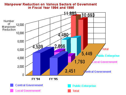 1. A hiring freeze should be instituted in all cases where it is judged to be unnecessary to fill an agency's existing vacant positions in order to carry out the agency's services. In the case of superfluous employees, a review should be instituted and the necessary measures taken. Taking each administering agency as a basic unit and taking the number of personnel in the agency's budget (including contract hires) as a baseline, the number of personnel must be reduced by five percent over a period of three years. In principle the reduction during the first year should be not less than two percent.